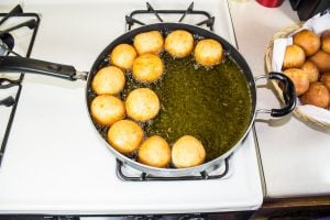- Halfway through forming the balls, put oil on the fire to heat. I poured about 2 litres of oil in a large pan. Now the temperature of the oil is very important. Let it get heated for 5 - 10 minutes on high heat then turn down the heat to medium. If you have a deep fryer thermometer, the temperature of the oil should be 325 degrees F (175 degrees C). When it is at this point, turn it to medium before dropping in your balls. That way, your balls cook through without burning quickly and remaining raw on the inside.